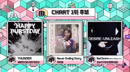 이날 공개된 1위 후보에는 세븐틴 'THUNDER', 아이유 'Never Ending Story', 엔하이픈 'Bad Desine'이 나란히 이름을 올렸다.