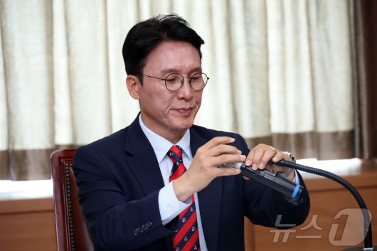 김민석 국무총리 후보자가 13일 서울 종로구 통의동 금융감독연수원에 마련된 청문회 준비단 사무실에서 열린 밥상물가 안정을 위한 경청 간담회에서 마이크를 만지고 있다. (공동취재) 2025.6.13/뉴스1 ⓒ News1 임세영 기자 |