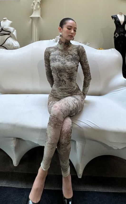 사진 속 제니는 누드 톤의 바디슈트를 착용하고 우아하면서도 고혹적인 자태를 뽐냈다 전신에 프린팅된 패턴이 시선을 사로잡으며, 몸의 곡선을 따라 흐르는 실루엣이 제니의 슬림한 몸매를 더욱 돋보이게 했다.