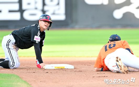 (엑스포츠뉴스 대전, 김한준 기자) 14일 오후 대전 한화생명 볼파크에서 열린 '2025 신한 SOL Bank KBO리그' LG 트윈스와 한화 이글스의 경기, 5회초 무사 1루 LG 최원영이 박해민의 내야땅볼때 2루에서 멈추고 있다.김한준 기자 kowel@xportsnews.com