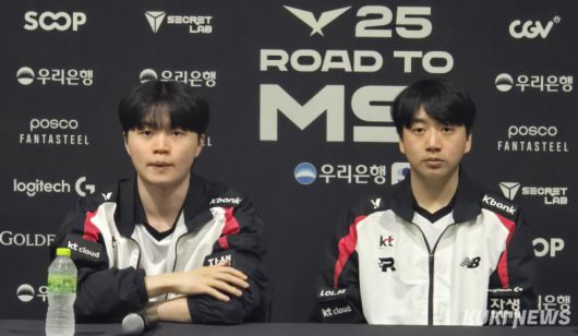 고동빈(오른쪽) KT 감독과 ‘비디디’ 곽보성이 14일 오후 3시 부산 사직실내체육관에서 열린 ‘2025 LCK 로드 투 MSI’ 4라운드 T1과 경기가 끝난 뒤 기자회견에 임하고 있다. 김영건 기자 |