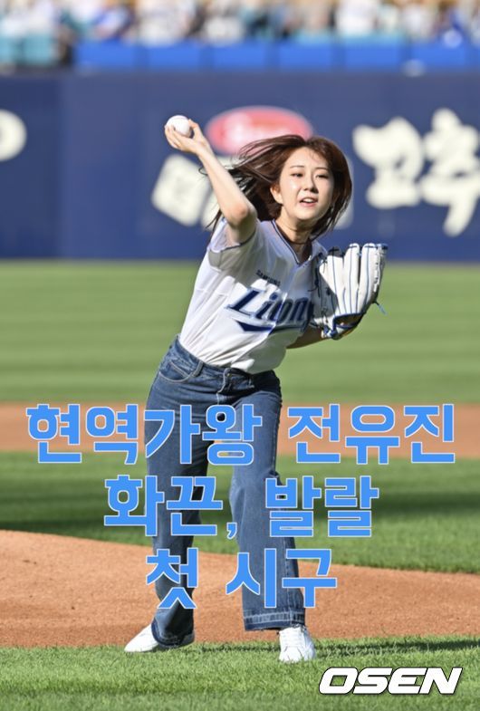 [OSEN=대구, 이석우 기자] 현역가왕 전유진이 14일 대구삼성라이온즈파크에서 열린 프로야구 삼성 라이온즈와 KT 위즈의 경기에서 애국가와 삼성 승리 기원 시구를 했다. / foto0307@osen.co.kr