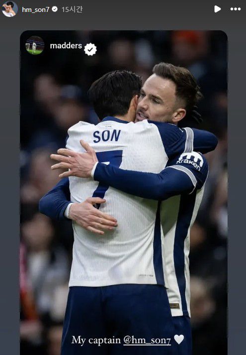 매디슨이 해당 소식을 접한 것 같다. 그는 자신의 사회관계망서비스(SNS)를 통해 손흥민과 껴안고 있는 사진을 공유했다. 그리고 "나의 주장 손흥민(My captain @hm_son7)"라는 글과 함께 하트 이모지를 덧붙여 공개했다.