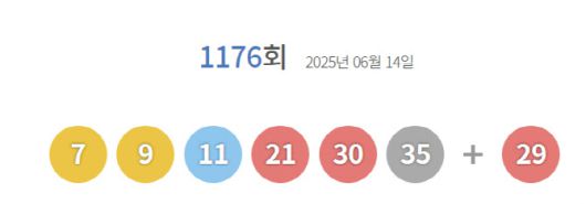 [이데일리 김한영 기자] 로또복권 운영사 동행복권은 14일 제1176회 로또 추첨 결과 1등 당첨번호가 ‘7, 9, 11, 21, 30, 35’라고 밝혔다. 보너스 번호는 ‘29’이다.
