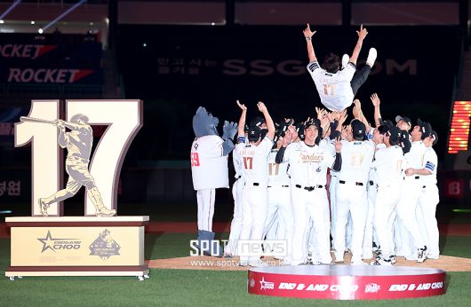 [스포티비뉴스=인천, 곽혜미 기자] 2025 신한 SOL Bank KBO리그 SSG 랜더스와 롯데 자이언츠의 경기가 15일 오후 인천 SSG랜더스필드에서 열렸다. 경기 종료 후 추신수 보좌역의 은퇴식이 열렸다. 추신수 보좌역이 헹가래를 받고 있다. <저작권자 ⓒ SPOTV NEWS. 무단전재 및 재배포 금지>