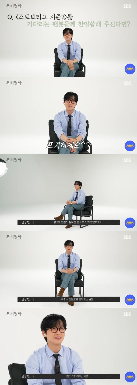 또한 '스토브리그'는 남궁민이 야구단 단장 자리에서 물러난 후 새로운 시작을 암시해 팬들의 시즌2 염원을 사고 있는 바. 이에 제작진은 시즌2를 기다리는 팬들에게 한 마디를 요청했고, 남궁민은 "포기하세요"라며 장난스레 답해 웃음을 유발했다.