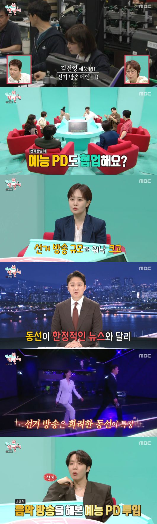 이에 양세형은 "예능국 PD들도 협업을 같이 하냐"고 물었고, 김수지는 "선거 방송 규모가 워낙 크고 사실 뉴스는 동선이 한정적인데, 선거 방송은 여기 저기 다 쓰고 동선도 화려하다 보니 음악 방송을 많이 해보신 분들이 투입이 된다고 하더라"고 답했다.