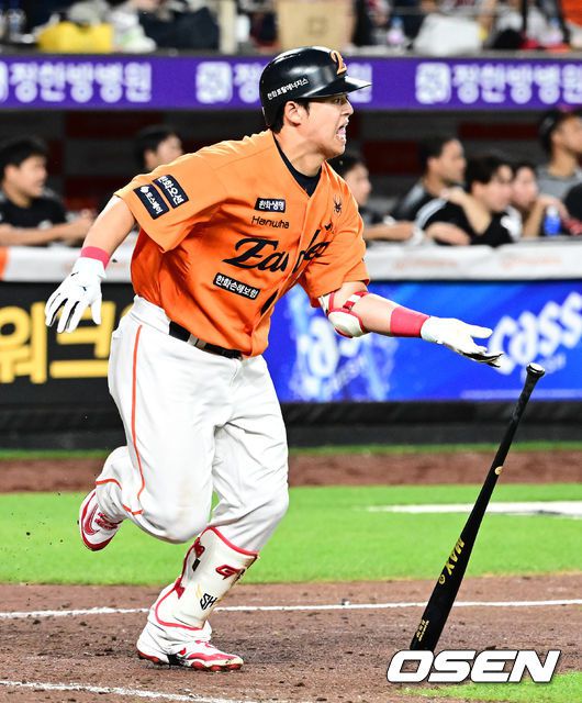 연장 10회말 1사 1,2루에서 한화 노시환이 유격수 땅볼 병살로 물러나며 아쉬워하고 있다. 2025.06.14 /jpnews@osen.co.kr