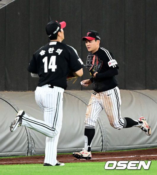 연장 11회말 2사 2루에서 LG 송찬의가 최원영과 교체되며 좌익수 자리로 들어가고 있다. 2025.06.14 /jpnews@osen.co.kr