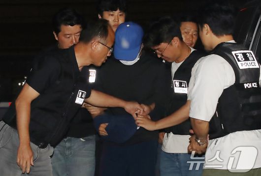 (대구=뉴스1) 공정식 기자 = 대구에서 스토킹 해오던 여성을 살해한 피의자 A씨가 15일 오전 대구성서경찰서로 압송되고 있다. A씨는 지난 10일 오전 3시30분쯤 대구 달서구 장기동의 한 아파트 외벽 가스배관을 타고 50대 여성 B씨 집에 침입해 살해한 뒤 도주했다가 나흘만인 14일 오후 10시45분쯤 세종시 조치원읍에서 경찰에 체포됐다. 2025.6.15/뉴스1
