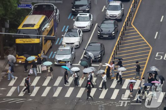 서울 중구 남대문로 일대에서 우산을 쓴 시민들이 퇴근길 발걸음을 재촉하고 있다. 2025.6.13/뉴스1 ⓒ News1 민경석 기자 |