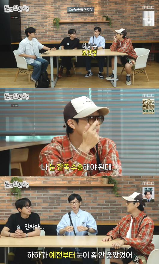 이에 하하는 "나 한 쪽 눈 수술 해야 된다더라"며 깜짝 근황을 전했고, 유재석이 "하하가 예전부터 눈이 좀 안 좋았다"고 하자 하하도 "눈이 안 좋았다"며 과거부터 좋지 않던 눈 상태를 털어놨다.