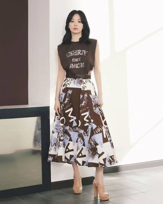 사진 속 송혜교는 마치 초대받은 하객처럼 단정한 포즈로 서 있는 모습이 포착돼, 일상과 패션 사이의 상상력을 자극했다.