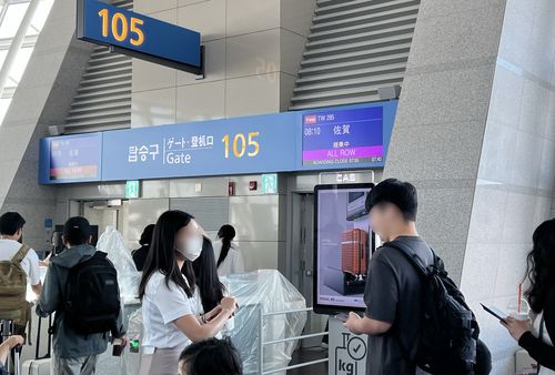 사가행 비행기에 오르는 젊은 여행객들 |