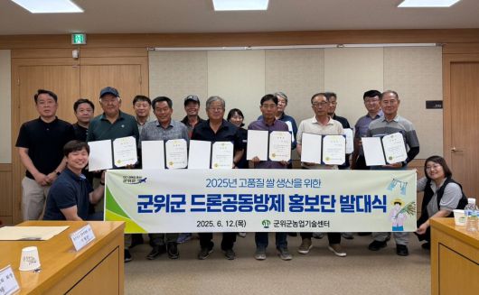 군위군은 6월 12일 군위군청에서 농협중앙회 군위군지부, 군위농협, 팔공농협, 쌀전업농, 각 읍면 리장협의회 등 25여 명이 참석한 가운데 '드론 활용 벼 병해충 공동방제 홍보단 발대식'을 열고 본격적인 방제작업에 돌입한다고 밝혔다.