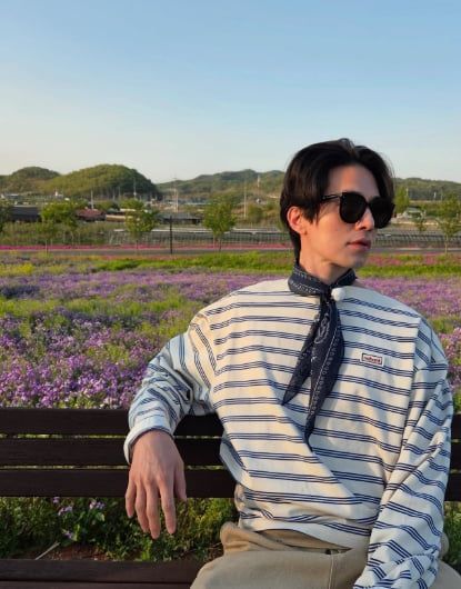 공개된 사진 속 이동욱은 보라색 꽃밭이 펼쳐진 들판과 푸르른 초원 사이에서 벤치에 앉아 여유로운 시간을 보내고 있다. 스트라이프 셔츠에 네이비 스카프, 선글라스를 매치한 이동욱은 도시적인 세련미와 시골 감성의 조화를 동시에 보여줬다.