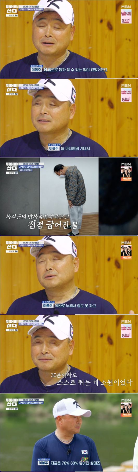 이봉주는 “똑바로 누워서 잠도 못 자고. 약의 의존해 잘 정도로 힘들었다. 내 몸으로 30분이라도 스스로 뛰는 게 소원이었다”라고 덧붙였다. 이봉주는 “지금은 70% 80% 좋아진 상태다”라고 말해 눈길을 끌었다. 이봉주는 “매일 아침 7~8km 뛴다. 많게는 10km를 달린다”라고 루틴을 설명했다.