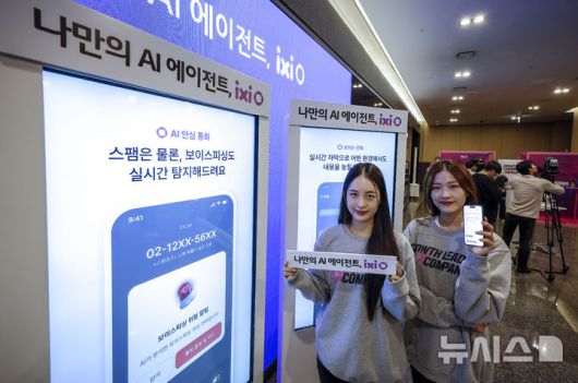 [서울=뉴시스] 정병혁 기자 = 7일 서울 용산구 LG유플러스 본사에서 열린 LG유플러스 AX전략 기자간담회에서 모델들이 LG유플러스의 AI통화 에이전트 '익시오(ixi-O)'를 시연하고 있다. 2024.11.07. jhope@newsis.com |