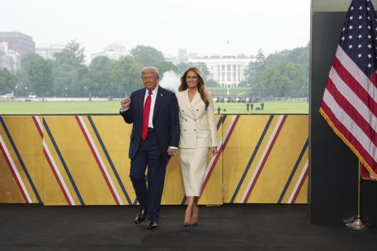 14일 열병식 행사장 무대에 오른 트럼프 대통령과 멜라니아 여사. 워싱턴=AP 뉴시스 |