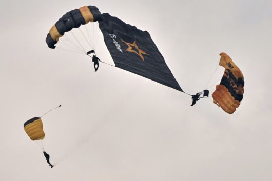 미 육군 낙하전문팀 골든 나이츠가 낙하산을 타고 내려오는 퍼포먼스를 펼치고 있다. 워싱턴=AP 뉴시스 |