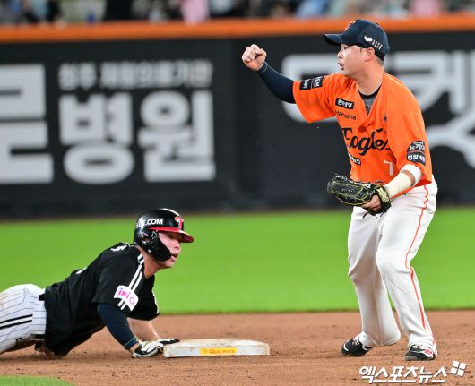 여기서 다시 한 번 이재원의 플레이가 반짝였다. 문성주의 타석, 1루주자 문보경과 3루주자 김주성이 더블스틸을 시도하자 LG의 작전을 간파한 이재원은 김서현의 3구가 들어오자마자 곧바로 유격수 이도윤에게 공을 던졌다. 이도윤도 다시 이재원에게 송구했다. 홈으로 뛰어든 김주성을 잡아낸 한화는 추가 실점 없이 이닝을 끝냈다.
