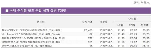 수익률 3위도 ‘미래에셋TIGER 코스닥150레버리지’ ETF가 차지했다. 수익률은 11.38%로 집계됐다. 이외에 ‘KB RISE 코스닥150선물레버리지’ ETF(11.16%)와 ‘한국투자코스닥두배로A’(11.14%) 펀드가 각각 수익률 4위와 5위에 자리했다.