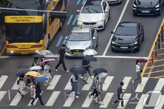 13일 오후 서울 중구 남대문로 일대에서 우산을 쓴 시민들이 퇴근길 발걸음을 재촉하고 있다. 2025.6.13/뉴스1 ⓒ News1 민경석 기자 |
