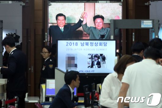 지난 2018년 4월 '남북정상회담 프레스센터'에 2000년 김대중 대통령과 김정일 북한 국방위원장의 남북정상회담 장면이 화면에 나오고 있다. 2018.4.26/뉴스1 ⓒ News1 송원영 기자 |