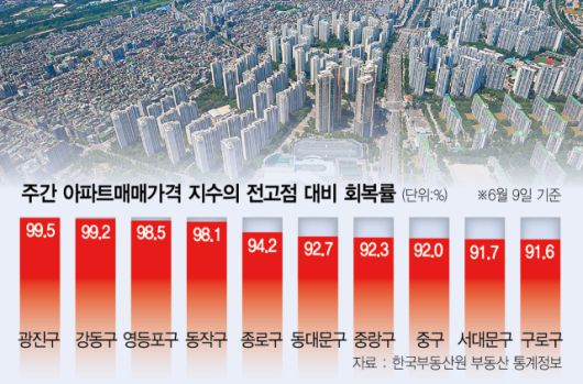 이달 둘째 주(6월 9일) 기준으로 전고점 대비 아파트값 회복률은 광진구가 99.5%로 가장 높고 △강동(99.2%) △영등포(98.5%) △동작(98.1%) △종로(94.2%) △동대문(92.7%) 등이 뒤를 이었다. 그러나 회복률이 가장 낮은 지역인 노·도·강의 경우 80%대 중반 수준이다. 강북이 86.5%, 노원이 85.7%, 도봉은 82.7%다.