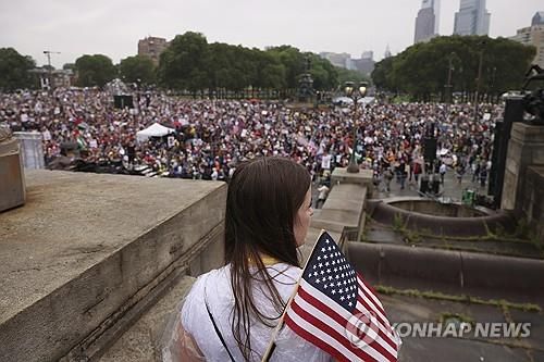 14일(현지시간) 미국 필라델피아 미술관 앞 광장에서 ‘노 킹스’ 시위대가 집회를 이어가고 있다. AP=연합뉴스 |
