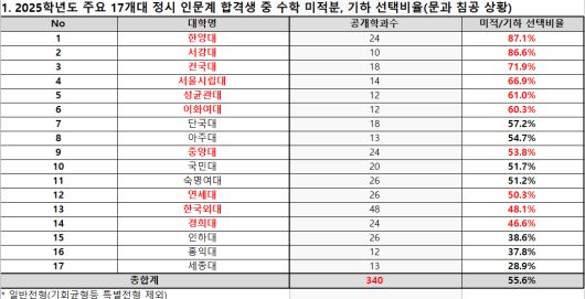 17개 대학은 건국대·경희대·국민대·단국대·서강대·서울시립대·성균관대·세종대·숙명여대·아주대·연세대·이화여대·인하대·중앙대·한국외대·한양대·홍익대다. 서울대와 고려대 등은 수학 선택과목 비율을 공개하지 않았다.