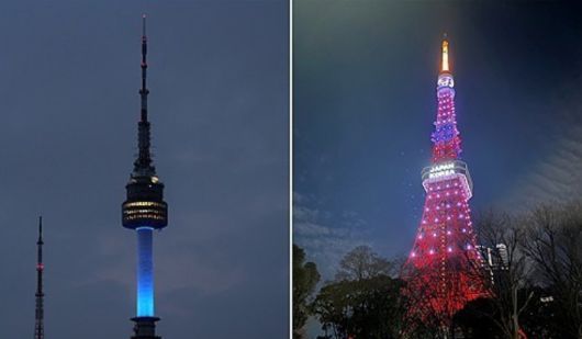 한일 수교 60주년 기념 점등하는 남산서울타워와 도쿄타워. 연합뉴스 |
