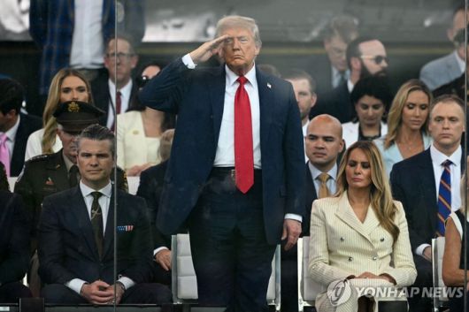 도널드 트럼프 미국 대통령이 14일(현지시간) 워싱턴DC에서 열린 미 육군 창설 250주년 기념 열병식에서 행진하는 군사들의 경례를 받고 있다. [연합뉴스] |