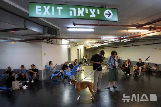 [텔아비브=AP/뉴시스] 15일(현지 시간) 이스라엘 텔아비브에서 이란의 미사일 발사로 공습경보가 울리자 시민들이 대피소에 대피하고 있다. 2025.06.15. |