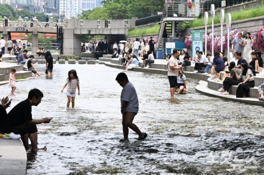 서울 종로구 청계천 일대에서 어린이들이 물놀이를 하고 있다. 류영주 기자 |