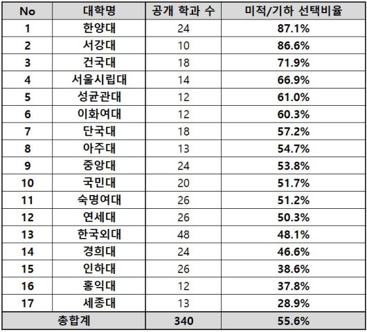 서강대 인문학기반자유전공학부(100%), 지식융합미디어학부(100%), 경제학과(89.7%), 영문학부(85.2%)도 마찬가지다. 한양대 교육공학과와 영어교육과도 각각 100%가 미적·기하 선택자였다.