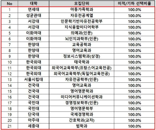 각 대학 학과별로 보면, 연세대는 인문계 합격생 중 50.3%가 미적분 또는 기하를 선택한 가운데, 아동가족학과는 합격생 전원이 미적·기하 응시생이었다. 이어 ▲응용통계학과(89.5%) ▲언더우드학부(87.5%) ▲융합인문사회과학부(86.5%) ▲통합디자인학과(80.0%) 등도 높은 비율을 보였다.