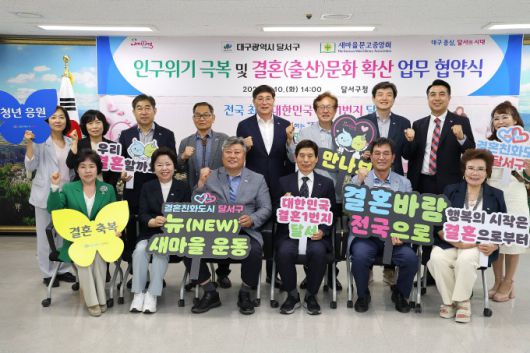 [대구=뉴스핌] 김용락 기자=대구 달서구(구청장 이태훈)는 새마을문고중앙회(회장 김종철)와 초저출생에 따른 인구위기 극복과 결혼문화 확산을 위한 업무협약을 체결했다고 15일 밝혔다.