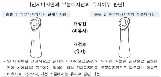 개정된 기준은 디자인 심사의 핵심인 유사 여부 판단기준을 바꿨다. 개정 심사기준에서는 2건 이상의 유사한 출원이 있을 때 전체디자인 또는 부분디자인으로 출원됐는지 여부와 관계없이 디자인의 실질적인 유사성을 판단해 등록 여부를 결정, 유사 디자인이 등록되지 않도록 했다.