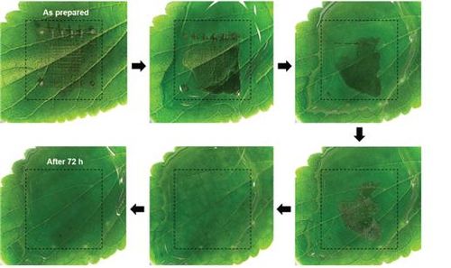 녹색 잎 위에 위치한 소자가 72시간 내 물속에 완전히 녹아 없어지는 모습 |