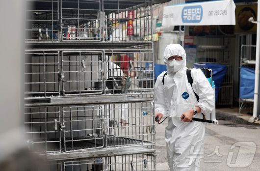 21일 광주 북구청 시장산업과 동물정책팀 직원들이 관내 한 재래시장 닭오리 판매업소에서 조류인플루엔자 예방을 위해 긴급 방역을 실시하고 있다.(광주 북구 제공. 재판매 및 DB 금지) 2025.5.21/뉴스1 ⓒ News1 박지현 기자 |