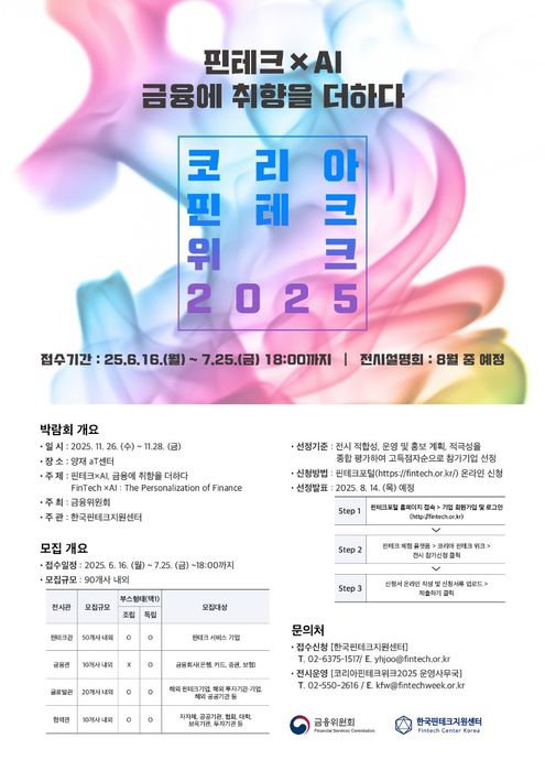 금융위원회는 이달 16일부터 '코리아 핀테크 위크 2025' 전시관 부스 참가 신청을 받고, 8월 4일부터 제 8회 핀테크 아이디어 공모전 참가 접수를 시작한다. 구체적인 참가 신청은 한국핀테크지원센터 운영사무국을 통하면 된다.