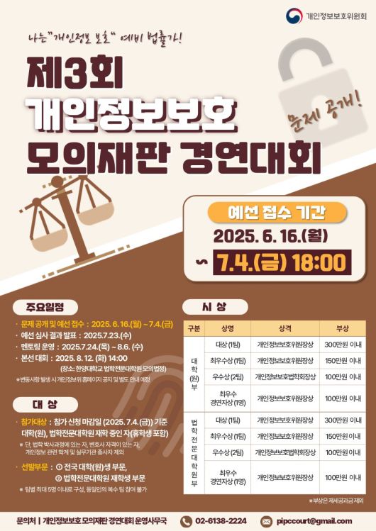 개인정보보호위원회가 내달 4일까지 '제3회 개인정보보호 모의재판 경연대회' 참가자를 모집한다.