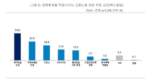 실제로 중소기업의 64.1%가 경영 상황이 전년보다 악화되었다고 응답했다. 경영 환경을 악화시키는 주된 고용 노동 요인으로 중소기업의 54%가 최저임금 인상을 뽑았고, 사회 보험료 인상(37.6%), 구인난(29.7%) 등이 뒤를 이었다.