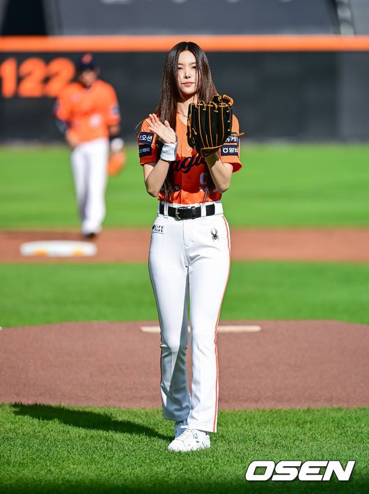 경기에 앞서 아일릿 윤아가 시구를 하고 있다. 2025.06.14 /jpnews@osen.co.kr