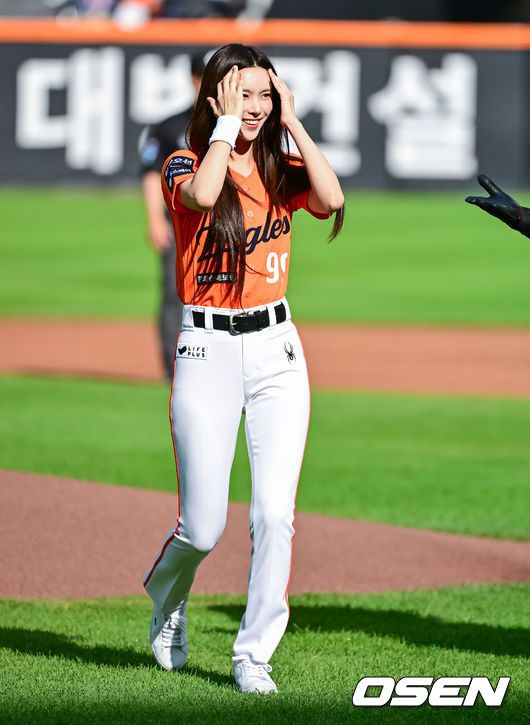 경기에 앞서 아일릿 윤아가 시구를 마치고 이동하고 있다. 2025.06.14 /jpnews@osen.co.kr