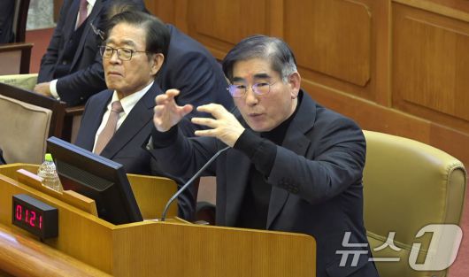 김용현 전 국방부 장관이 23일 오후 서울 종로구 헌법재판소에서 열린 윤석열 대통령 탄핵심판 4차변론에 증인으로 출석해 발언하고 있다. (헌법재판소 제공) 2025.1.23/뉴스1 |