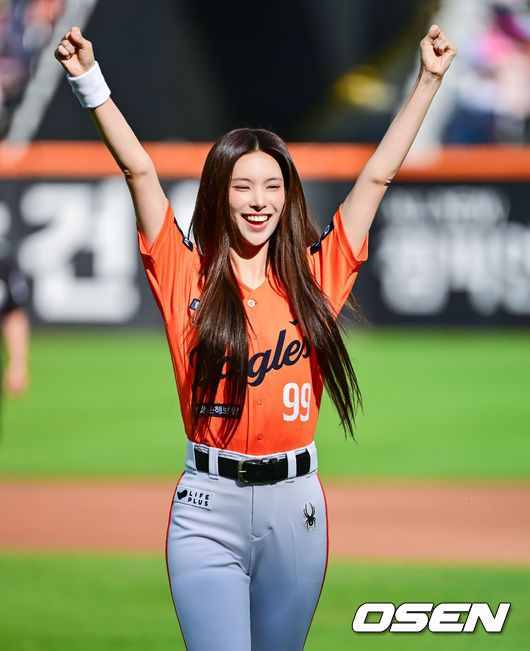 경기에 앞서 아일릿 윤아가 시구를 마치며 기뻐하고 있다. 2025.06.14 /jpnews@osen.co.kr