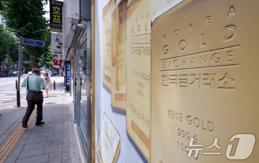 (서울=뉴스1) 김성진 기자 = 이스라엘의 이란 핵시설 공습과 이에 대한 이란의 미사일 보복이 이어지면서 금값이 사상 최고치에 근접했다. 뉴욕 상업거래소에서 금 선물 근월물 가격은 13일 오후 3시 18분 기준 온스당 3천457달러로 전장보다 1.6% 올라 지난 4월 22일 이후 약 2개월 만에 사상 최고치였던 온스당 3,500달러 돌파를 다시 눈앞에 뒀다. 15일 서울 종로구 한국금거래소 종로본점에 골드바 광고판이 설치되어 있다. 2025.6.15/뉴스1