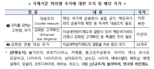 그 외 24개 국가는 강화된 관찰 대상 국가로 분류됐다. 불가리아, 부르키나파소, 카메룬, 콩고민주공화국, 아이티, 케냐, 모나코, 모잠비크, 나미비아, 나이지리아, 남아프리카, 남수단, 시리아, 베네수엘라, 베트남, 예멘, 알제리, 앙골라, 코트디부아르, 레바논, 라오스, 네팔 (신규 추가) 볼리비아, 영국령 버진제도 등 24개 국가는 자금세탁방지제도의 결함을 치유하는 국가다.